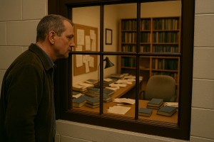 From outside I peer through the window of what used to be his office. It’s someone else’s now—photos of a different family, different awards, different messy stacks of paper. A person I do not know and who does not know me, or even my father. They’ve been there long enough to have their clippings fade to yellow. The room has moved on.